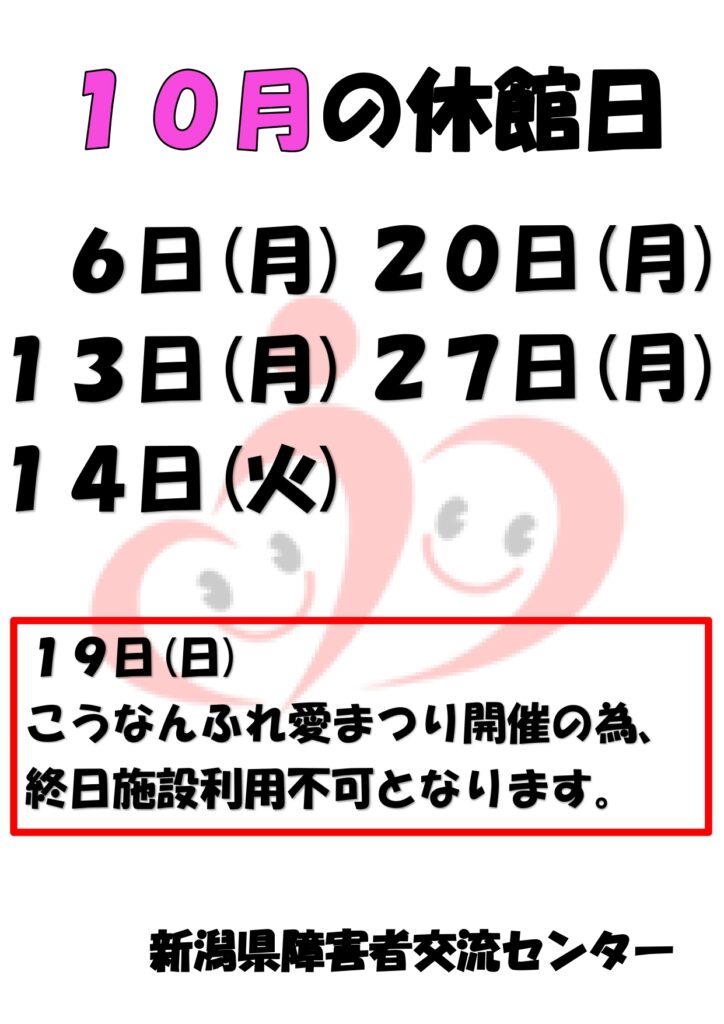 いつも当センターをご利用いただき誠にありがとうございます。 10月の休館日についてお知らせいたします。 6日(月曜日) 13日(月曜日) 14日(火曜日) 20日(月曜日) 27日(月曜日) 19日(日曜日)はこうなんふれ愛まつり開催の為、終日施設利用不可となります。 下記画像もご確認の上ご来館ください。 皆様のご来館をお待ちしております。