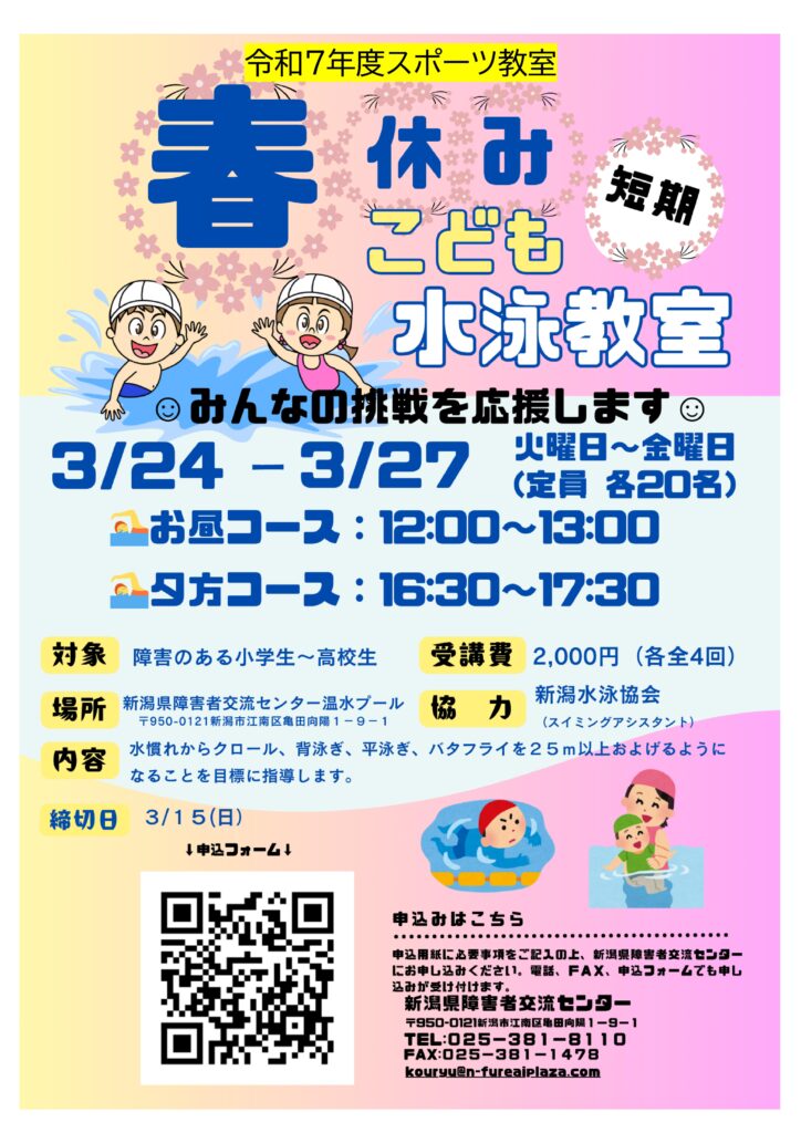 令和8年3月24日(火)25日(水)26日(木)27日(金)(全4回)に春休みこども短期水泳教室🏊の参加者募集のお知らせです。
