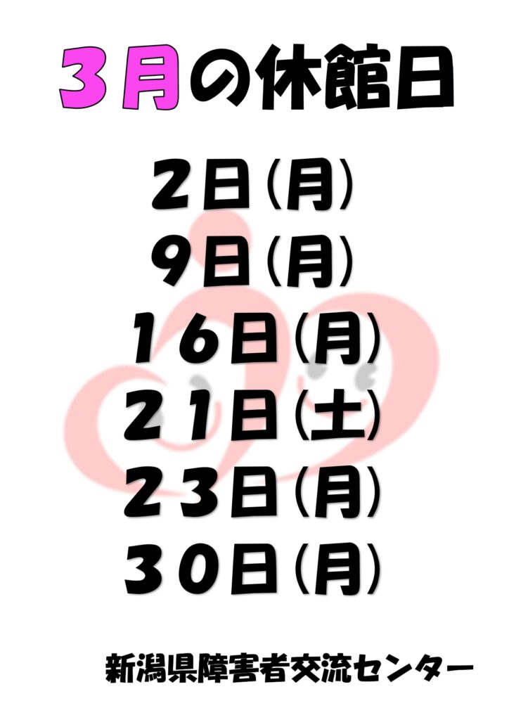令和8年3月の休館日についてお知らせいたします。